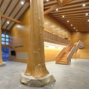 象徴木のヒノキは樹齢240年。天然唐松、ケヤキは突板合板にし、杉、赤松、栗、檜、唐松は製材して内装の壁板に使われ、地域材の唐松でつくった木製サッシ、外壁T&Tパネルなど、あらゆるところに地域材を用いて、村民が誇りと親しみを感じられる庁舎となっている。