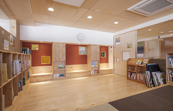 構造体には地場産の東濃ヒノキを利用しておおらかな屋根掛けを施し、地元の材料を多用した居心地のよい園舎とした。