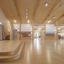 な遊戯室など、みんなが一緒に集まることができる空間をつくり出した。園児たちは園室を飛び出ると、園庭や遊戯室など遊びの居場所を自由に選択・活用でき、異年齢の子どもたちや先生たちとの楽しく積極的な遊びにつながる空間づくりを行った。